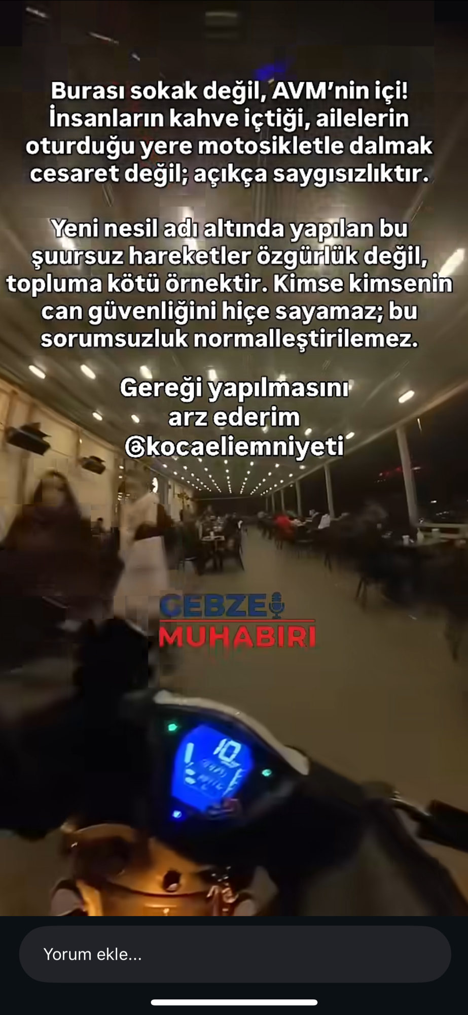 Gebze’de bir alışveriş merkezinin içerisinde motosikletiyle kafenin bahçe bölümüne girerek müşterileri rahatsız eden sürücünün görüntüleri kamuoyunda büyük tepki topladı. O anlar ilk olarak Gebze muhabiri tarafından gündeme taşındı ve kısa sürede sosyal medyada geniş yankı uyandırdı.